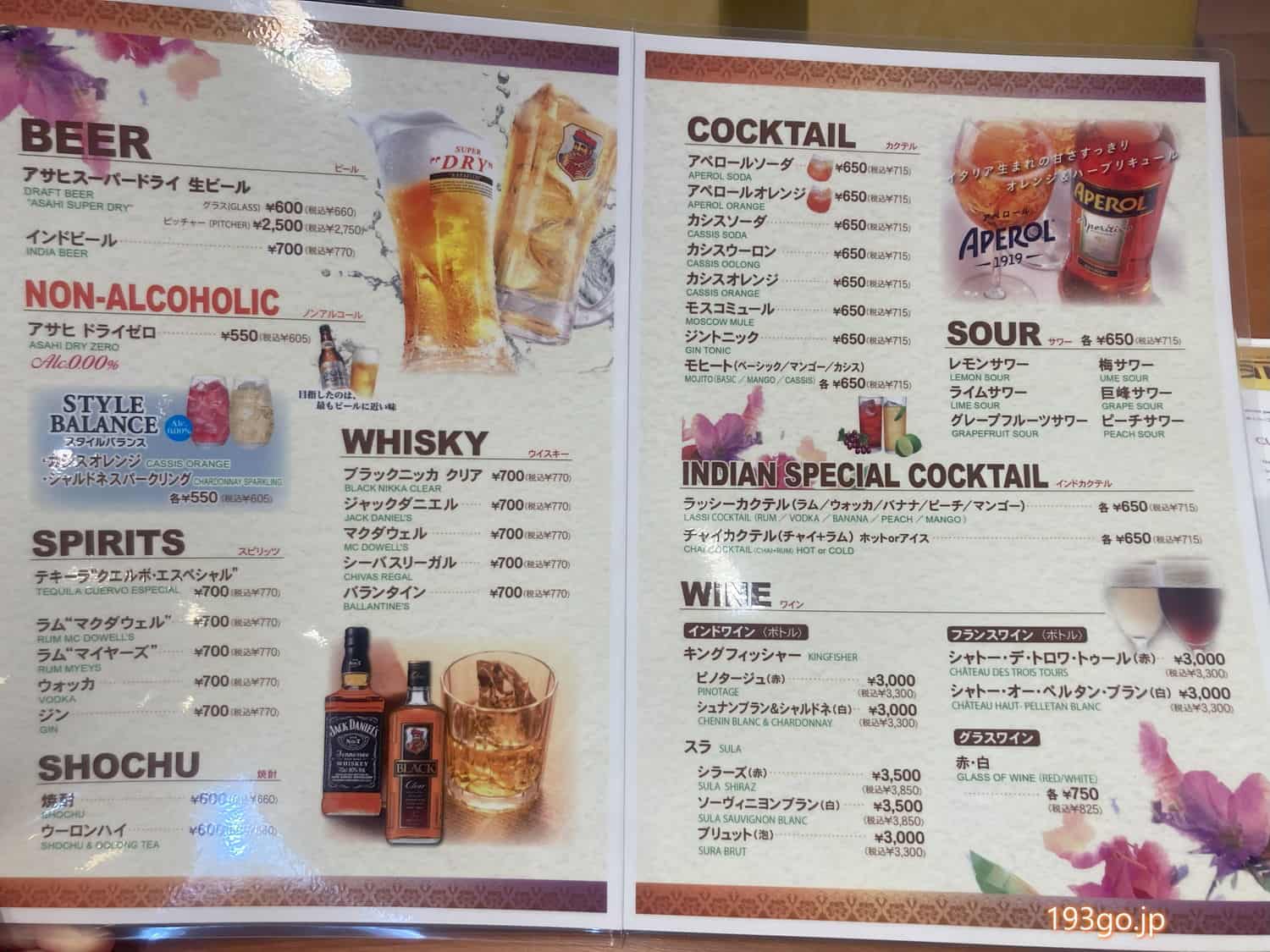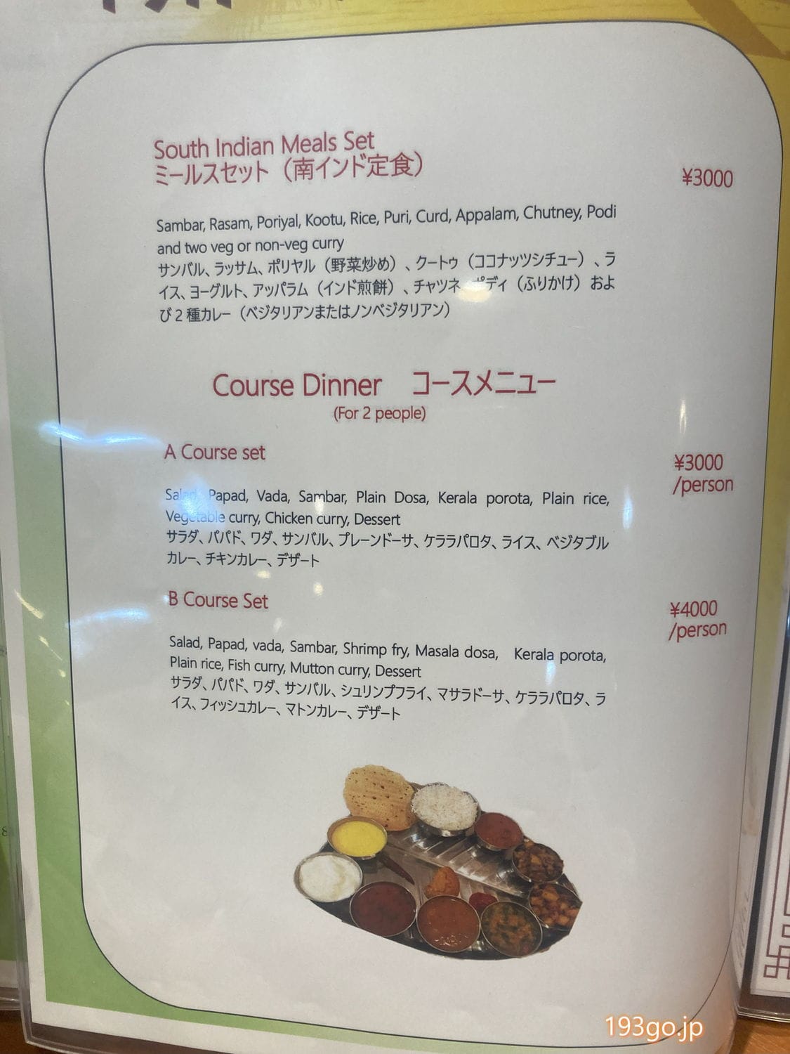 ドリンク付きのナンとカレーのセット1,300円、マサラドーサセット1,200円などの手頃に食べられるディナーセットの他、ミールスセット3,000円、コースメニューは3,000円~。(税抜)