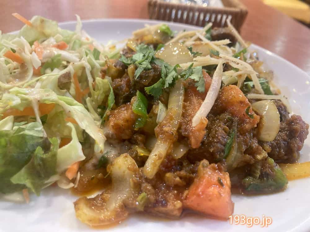 マトンの独特の風味とスパイスの味わい(カレー)にオニオンやレタスなどの野菜を混ぜ合わせながら。辛さは抑え目。