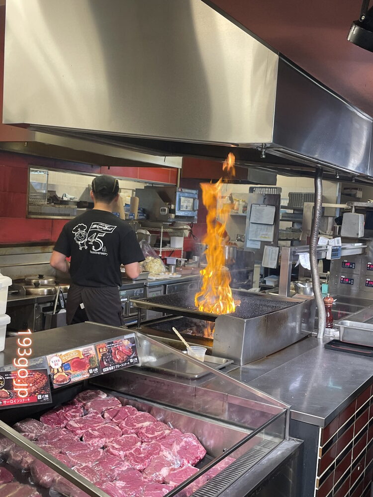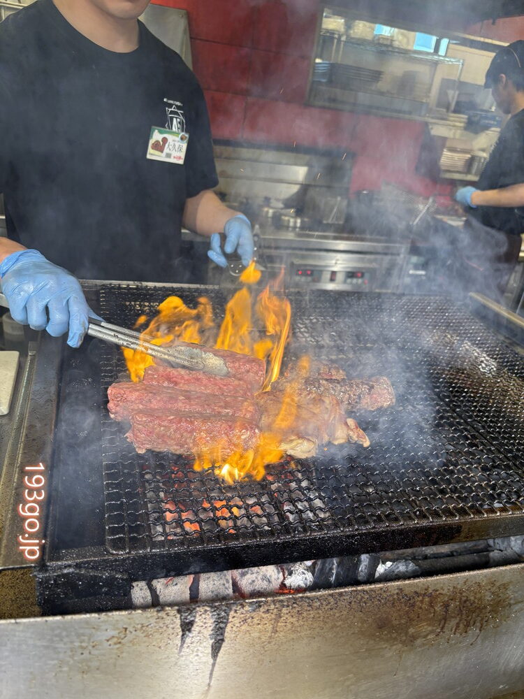 分厚いステーキやハンバーグを炭火で焼き上げるシーンも。炎を立ち上げ迫力満点!音や匂いにも食欲をそそられる~。