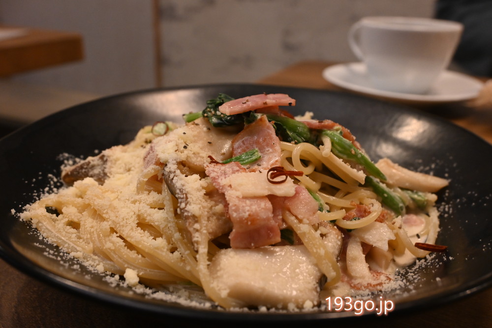 パスタはプリプリのキノコとほうれん草、ベーコン入りのクリーム仕立て。