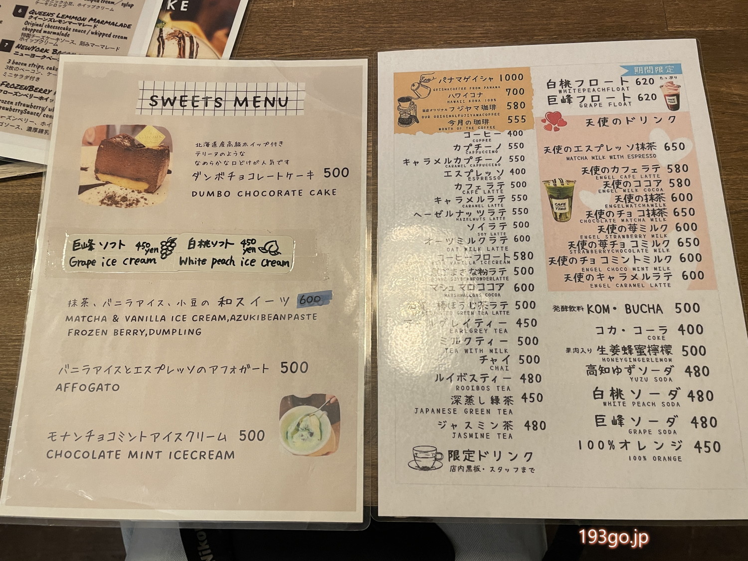 ドリンクはコーヒー各種、ラテ、ティーの他、白桃や巨峰のフロート、ココアやミルク、コンブチャ、生姜レモン…など。