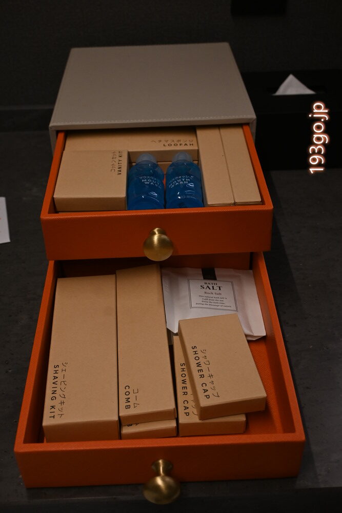 更に、アメニティボックスの中には、竹素材の歯ブラシやコーム、シェービングキット、コットン&綿棒の他、ヘチマのボディスポンジやマウスウォッシュにバスソルトも!