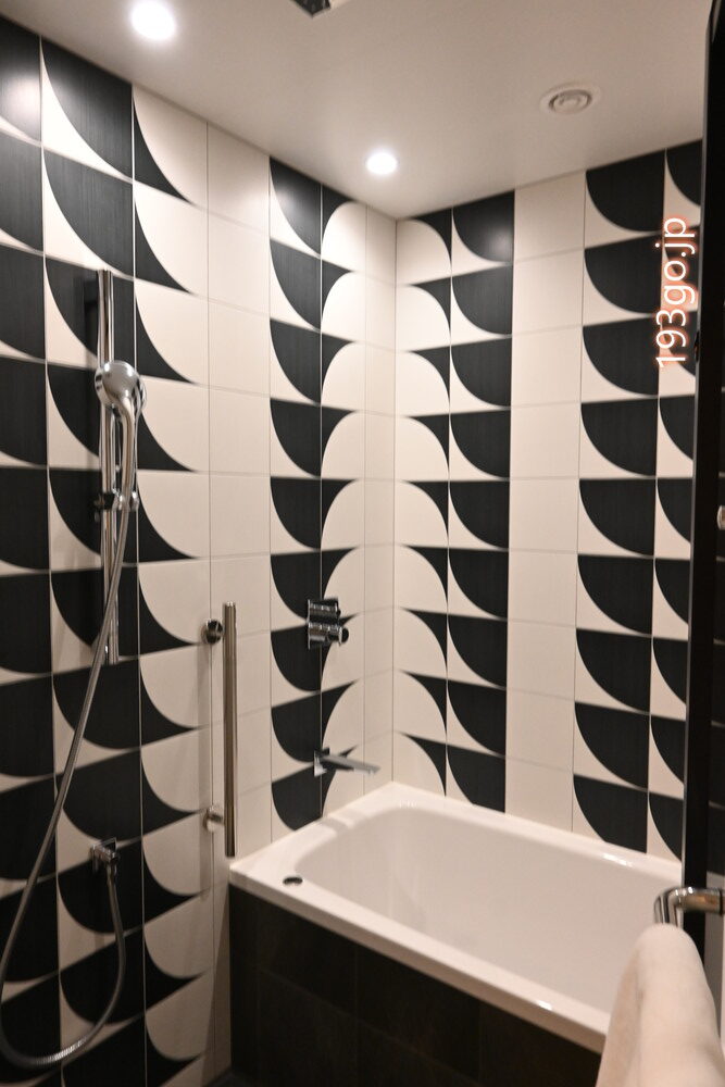 レインシャワーとハンドシャワー、バスタブ付きのモノトーンのバスルーム。