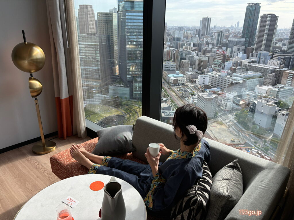窓辺のソファーに座ると、広い窓から緑あふれるうめきた公園や淀川を一望。