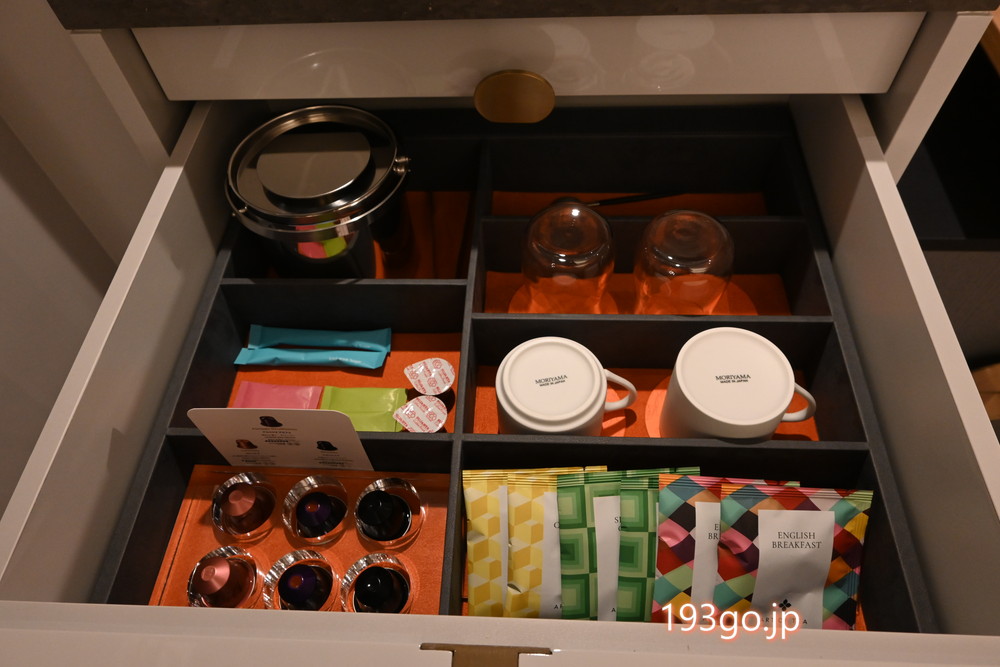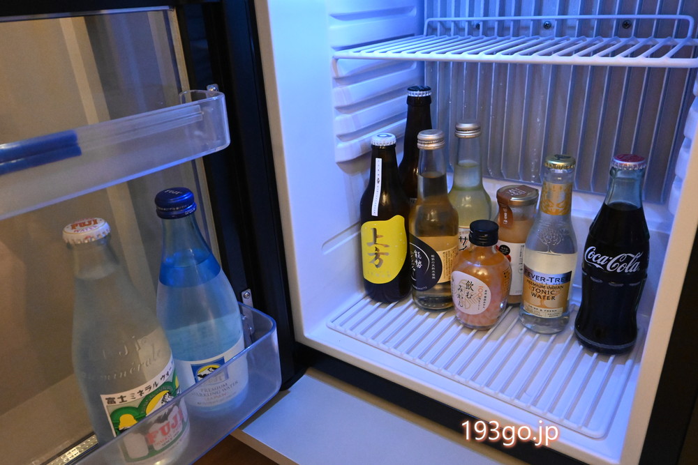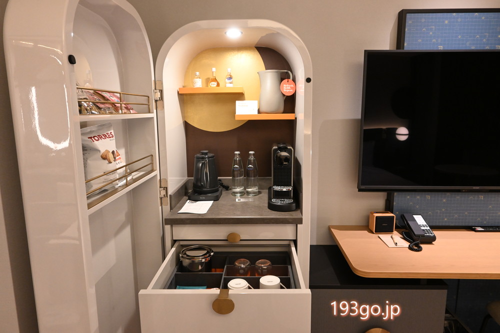 扉を開けると、コーヒーマシン、ポット、カップ、グラス、アイスペール、有料のスナックやアルコール類。下の段の冷蔵庫の中にも多種類のドリンクが。