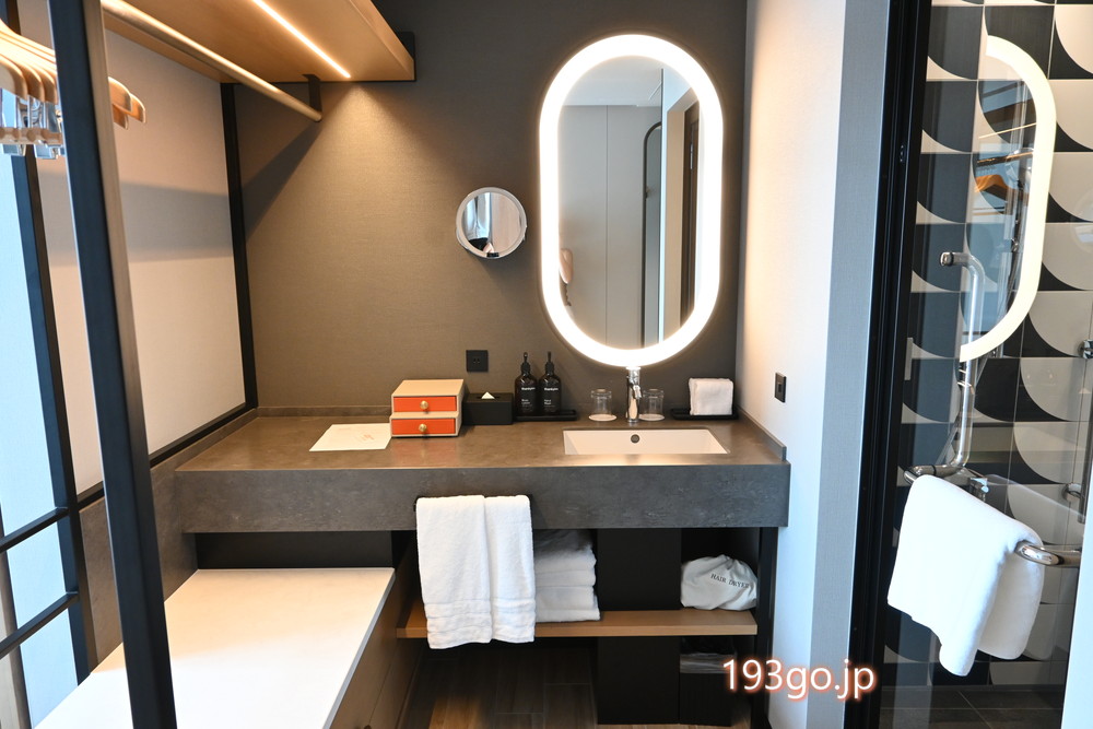 照明付きの女優ミラーが設置された洗面台に、バスタオルやフェイスタオル、バスローブ、SALONIA(サロニア)ドライヤー、ハンドソープとボディローション。