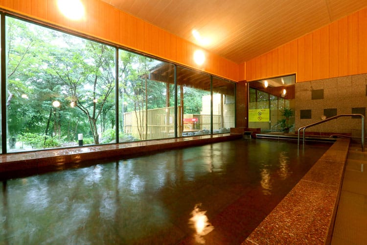 大浴場へ!緑とせせらぎの露天風呂、関東屈指の重曹泉