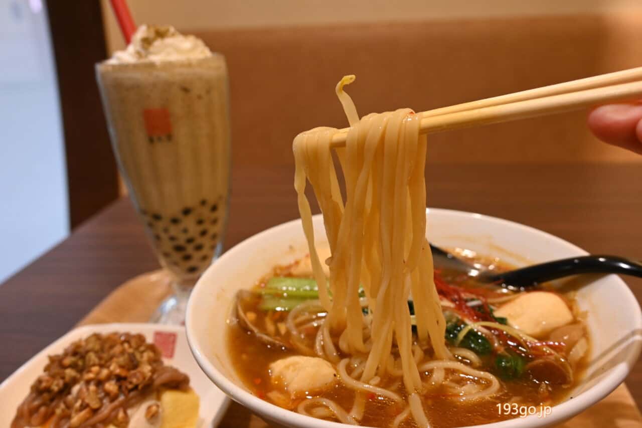 春水堂オリジナルのもちもちの中華麺に、スープは醤油ベースの鶏白湯スープにオリジナルスパイスミックスや麻辣スパイスがふんだんに使用され、食べ進めると口の中がピリピリ、お腹も温まって来る。辛すぎず、程よいピリ辛さで食べやすい。