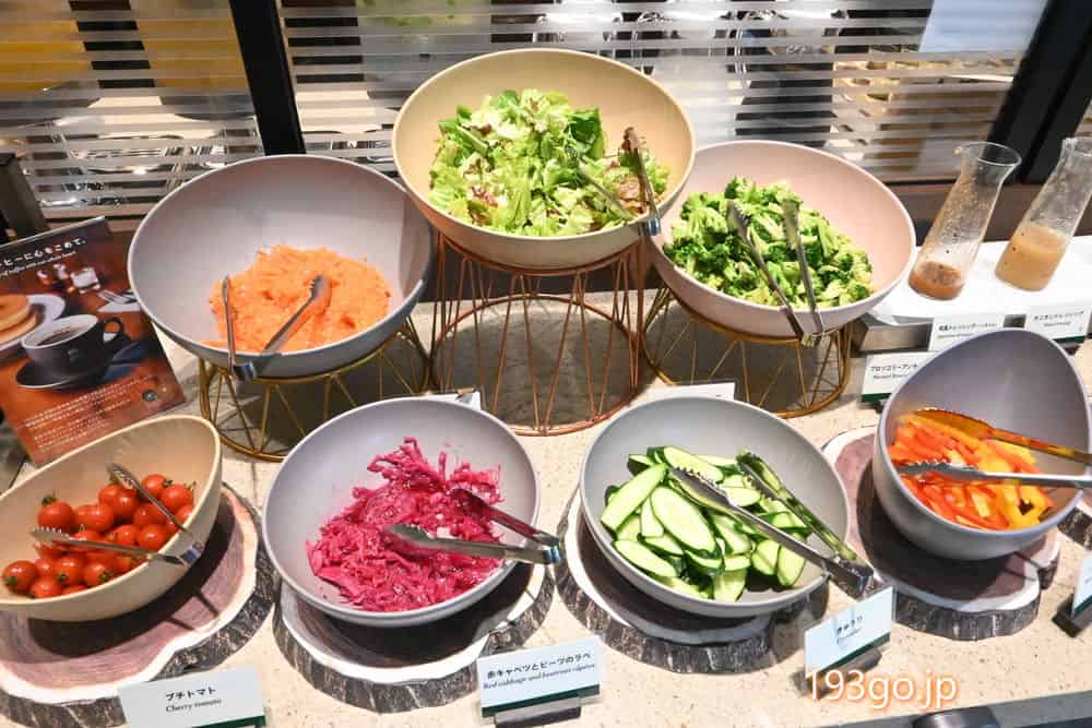 ビュッフェ台にはサラダ、フルーツ、スープにドリンクが並ぶ。