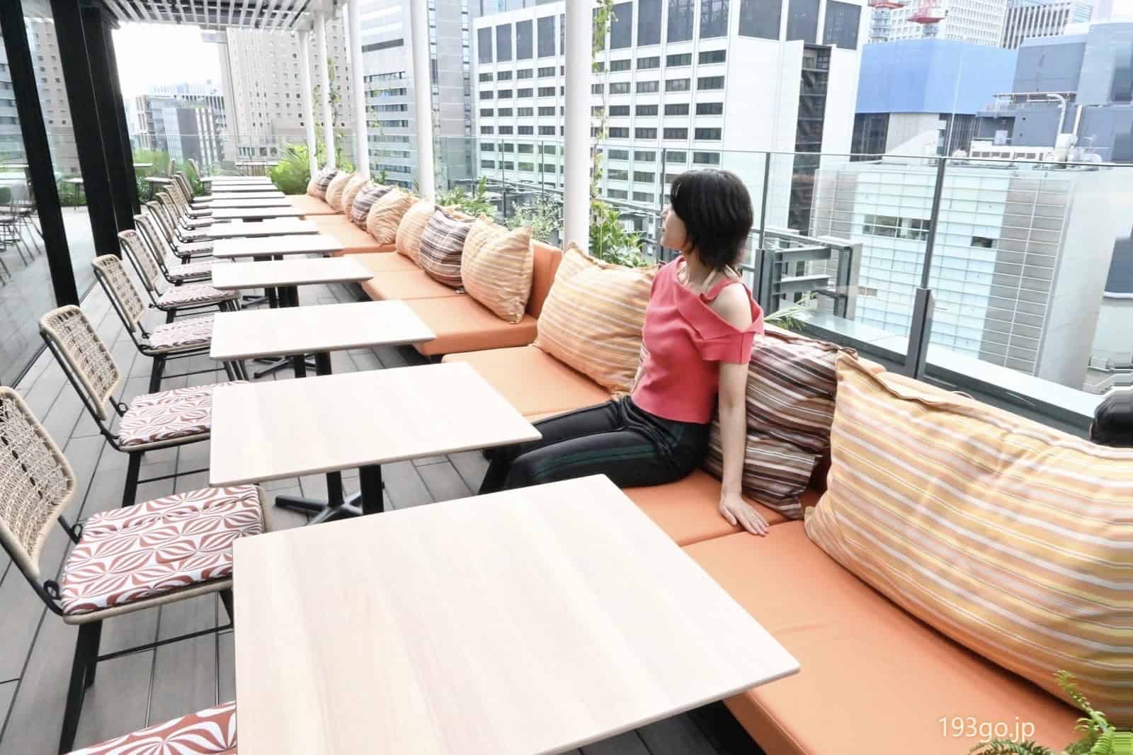 天空に広がるようなルーフトップバーは、緑やカラフルなソファーがゆったりと置かれ、リゾート感あふれる隠れ家的空間だ。