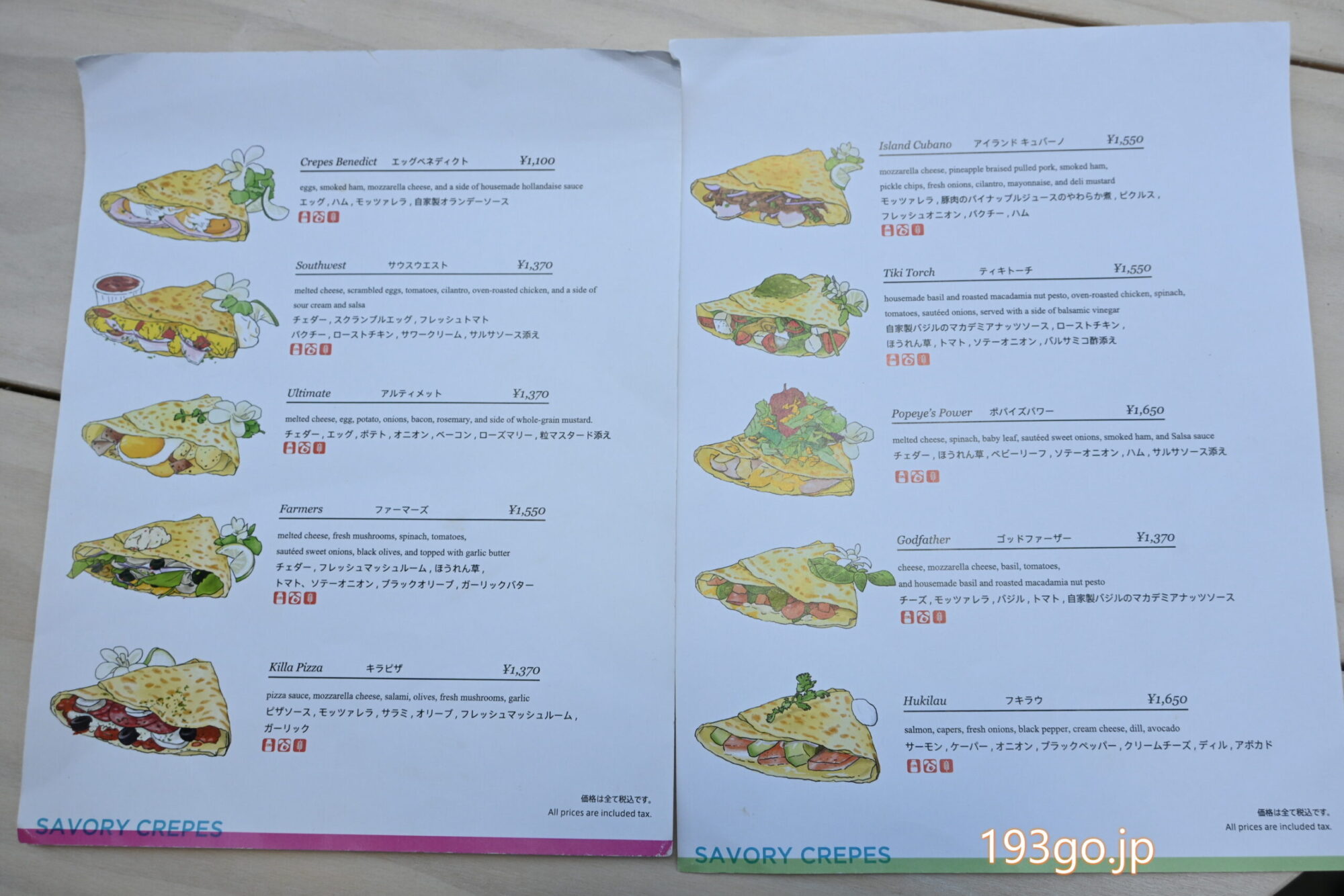 セイボリー(食事)とスイーツクレープ メニュー表と値段