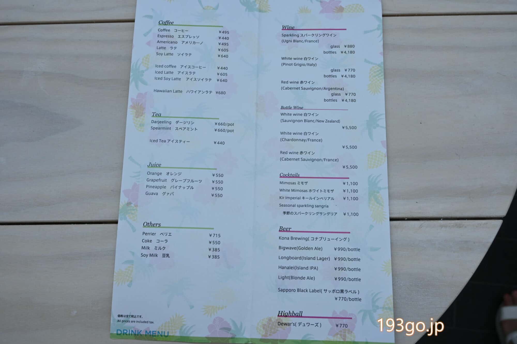 ドリンクはコーヒー、ティー、グァバやパイナップルジュース、ワイン、カクテル、ビール各種。