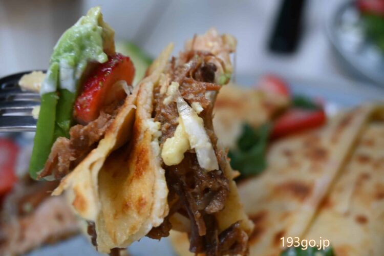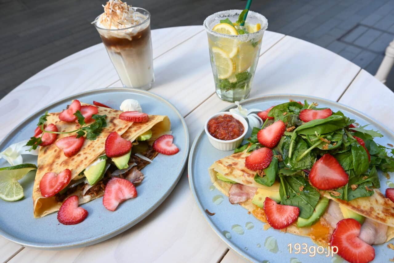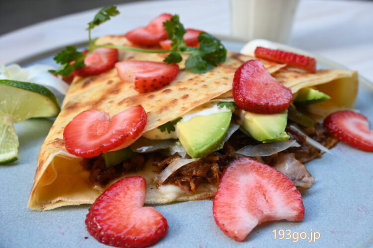 クレープは1つずつお皿に盛られ、ナイフとフォークで頂きます。モチモチした皮に具がたっぷり。更に、いちごとアボカドもトッピングしたので、生地の上にスライスいちごが散りばめられ、アボカドは中にゴロゴロでカラフル!