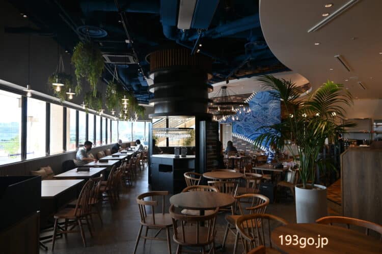 東京湾側に面したレストランは、窓が大きく明るく爽やか!窓際にゆったりソファー席、奥にはバーカウンターと広々。席数は180席だ。