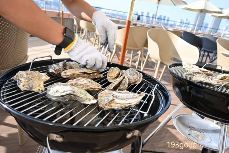 炭火でやわらかくジューシーに焼き上げる米国Weber社のふた付きBBQグリルでの焼き牡蠣は、プルプルで香ばしく旨味がたっぷり。次々と食べれちゃう、これが食べ放題は嬉しい。