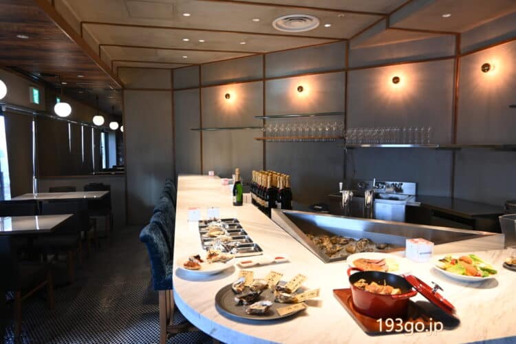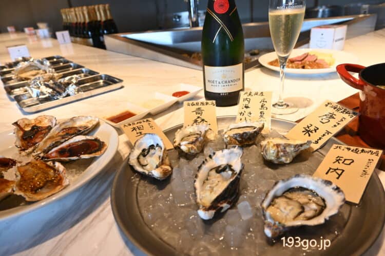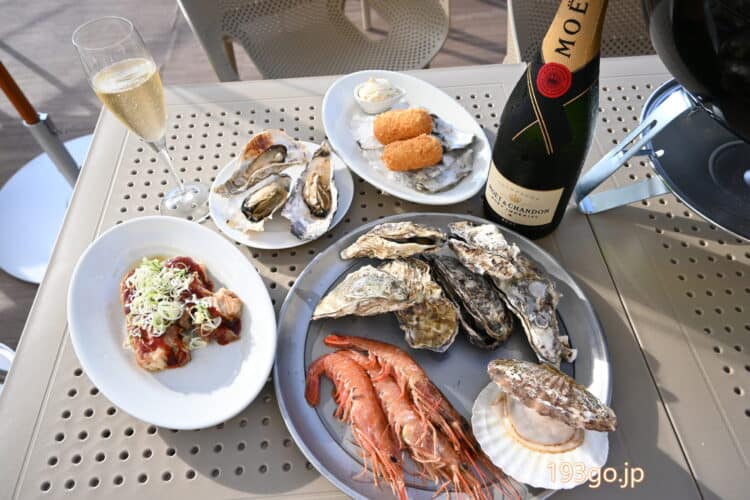 おすすめの生牡蠣2ピースとカヴァやシャンパーニュ〈モエエシャンドン〉などシャンパンとのお得なセット。