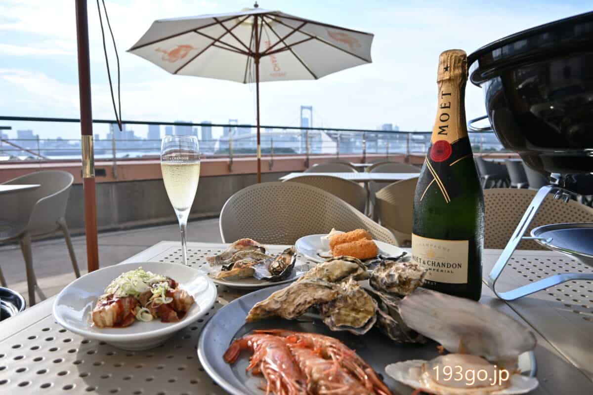 夜は贅沢な夜景にうっとりしながら牡蠣×シャンパンを満喫。