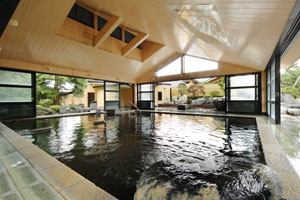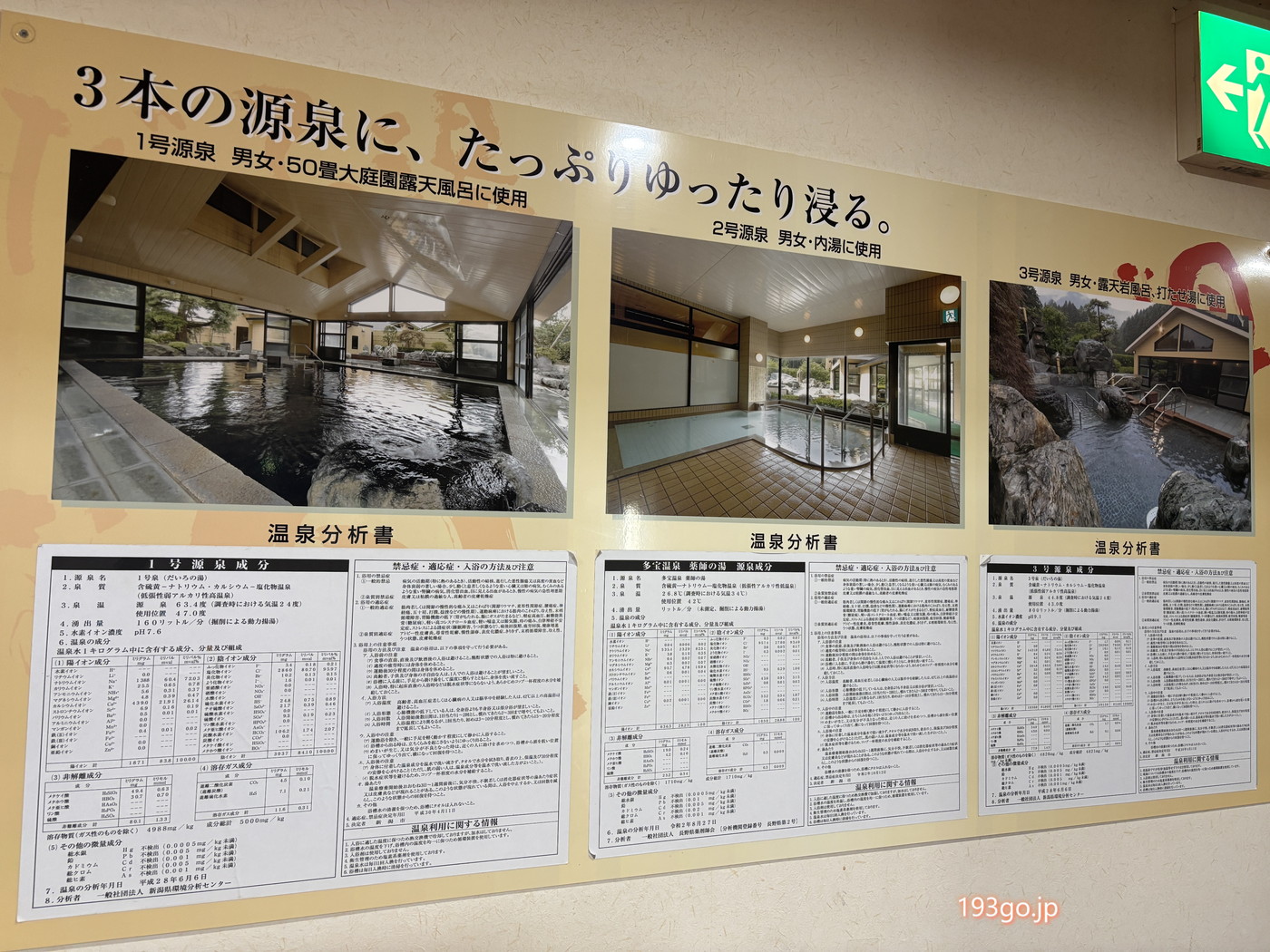 日帰り温泉施設としては珍しい、三本の源泉があり、それぞれ特徴のある温泉を一度に三種類も楽しめる。