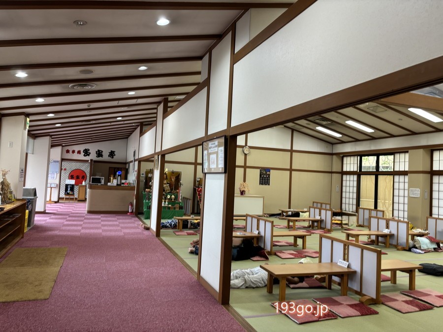 1階に畳の休憩処、奥に食堂(平日は15時まで)。