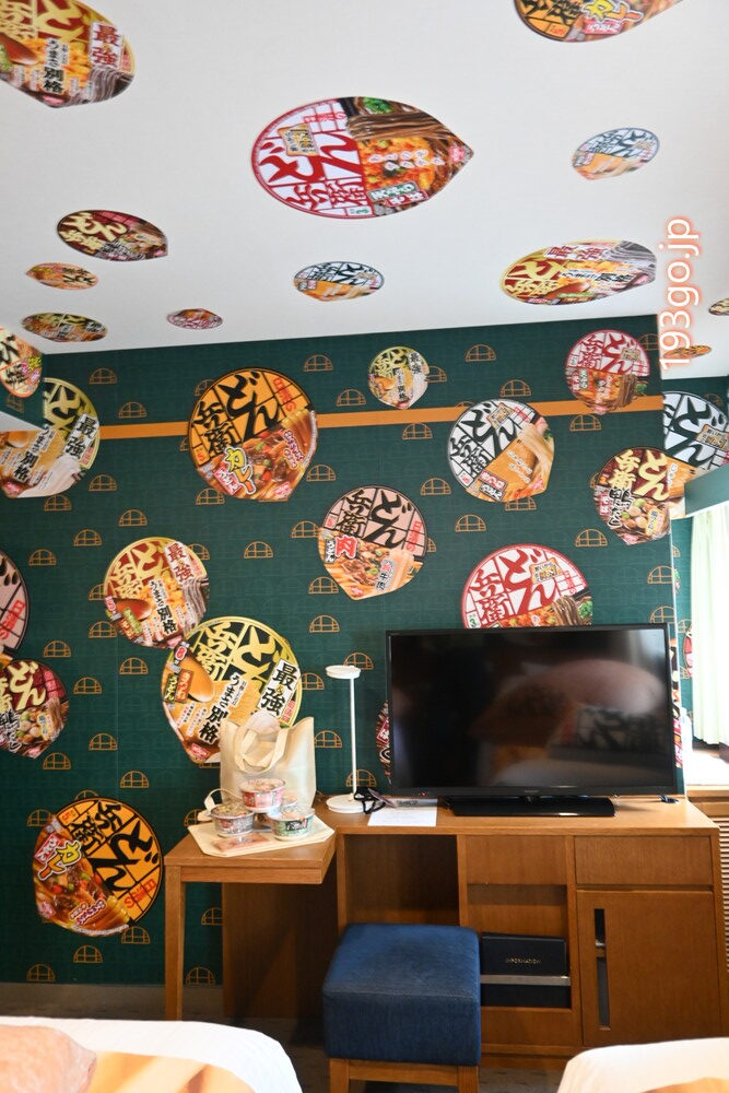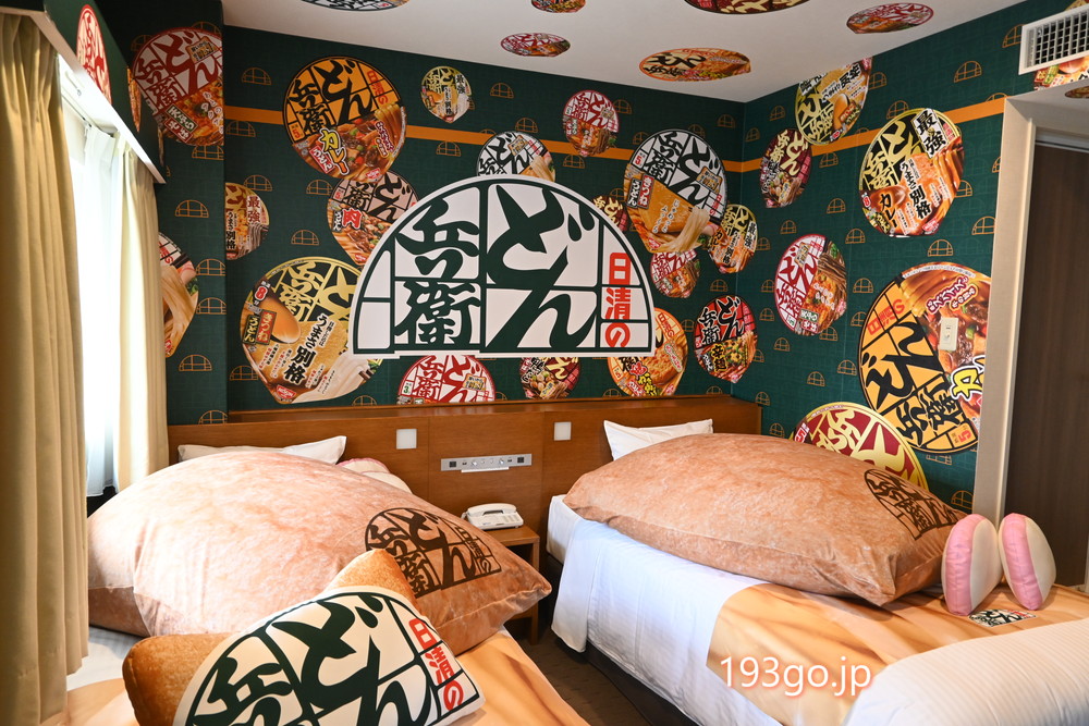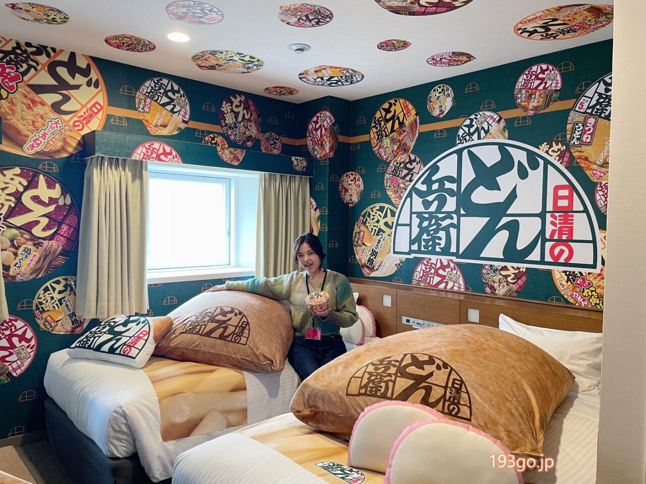 夢にまでどん兵衛が出てきそうな、強烈なインパクトの「どん兵衛ルーム」での宿泊は、後にも先にも忘れられない思い出となりそう。