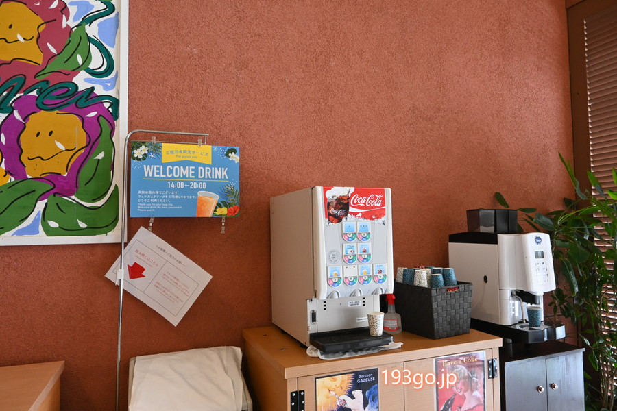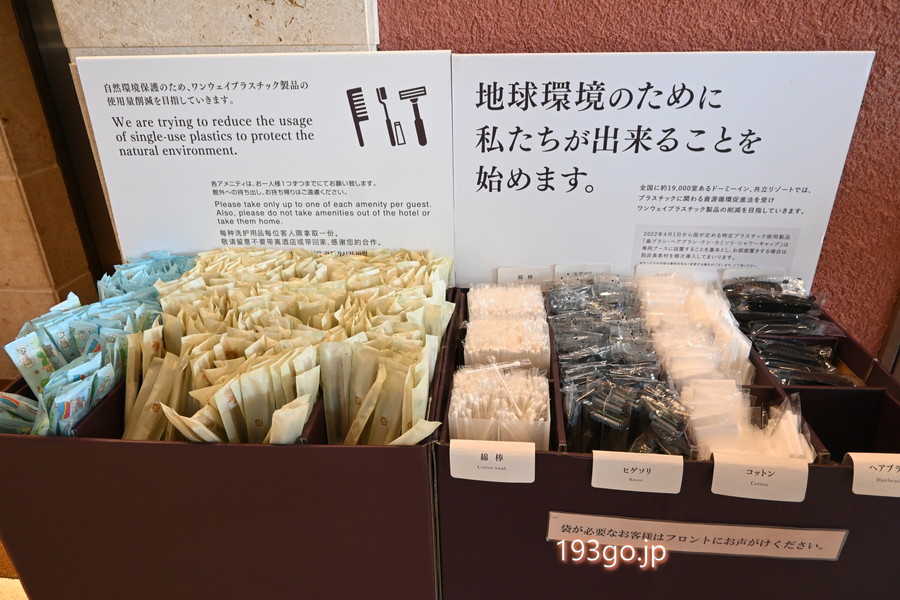 チェックイン後に、ロビーでウェルカムドリンク、アメニティもピックアップ。