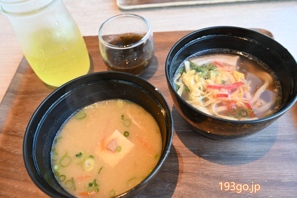 スープかフルーツと生ハムの盛り合わせが選べ、二人で一つずつオーダー。