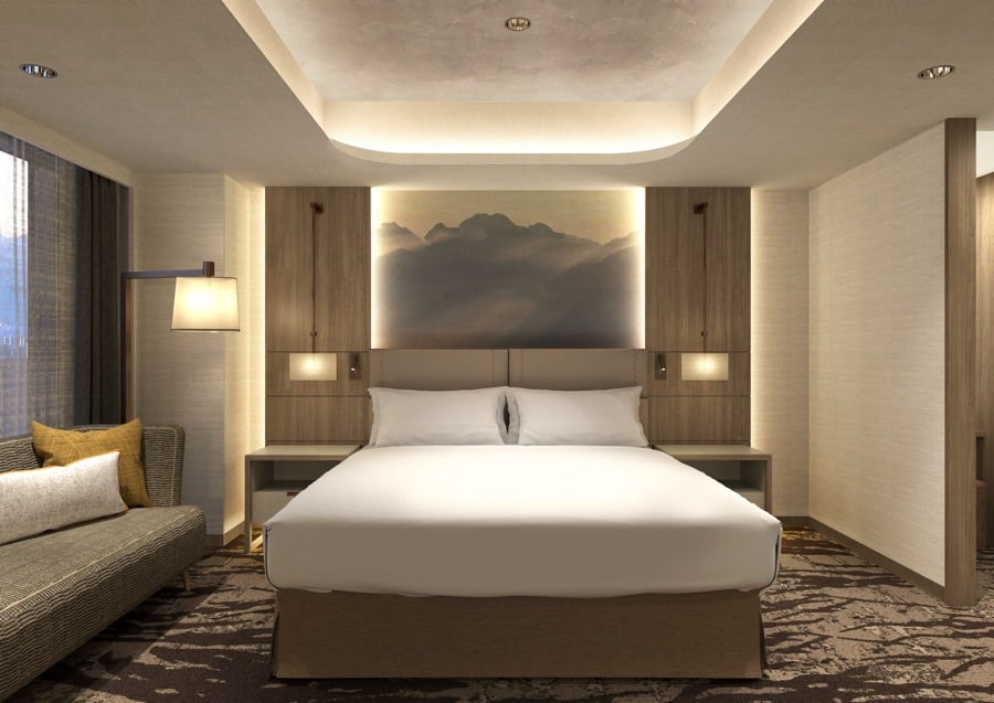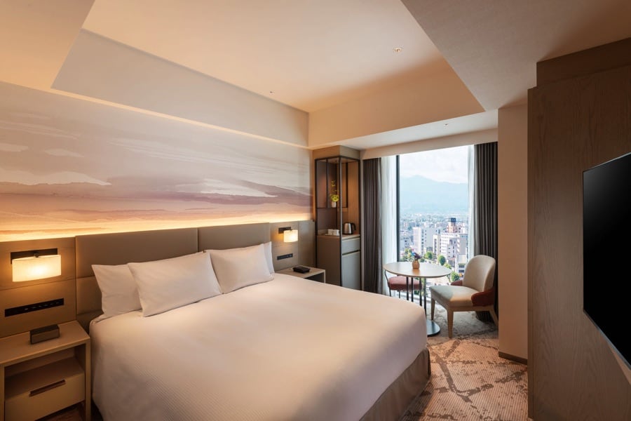 客室は、優しく落ち着いた木目調の色合いとコンテンポラリーなデザインが融合したインテリアと富山が誇る立山連峰をモチーフに描かれた壁紙やカーペットが施されている。