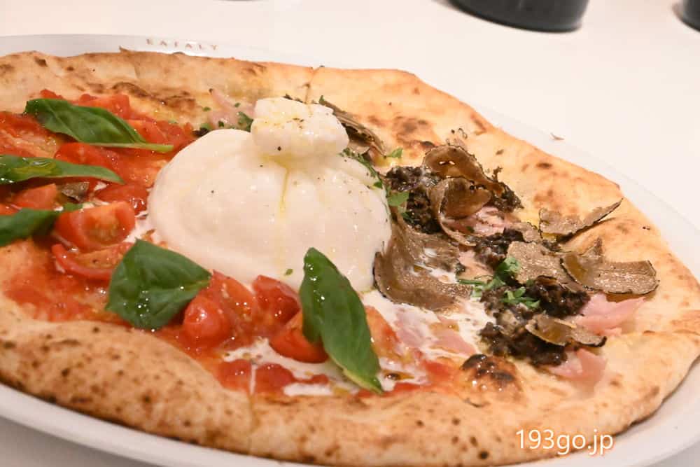 イータリー銀座店2周年記念メニューのフレッシュトマトとトリュフのハーフ&ハーフピザ。