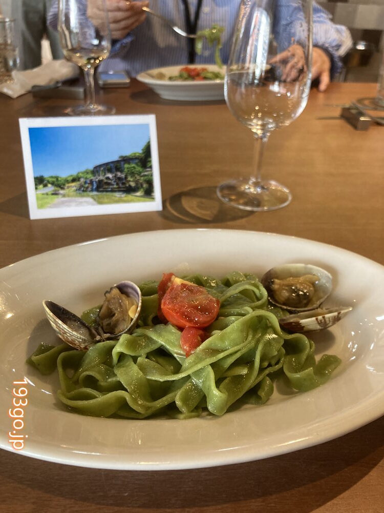 明日葉(あしたば)を練り込んだ鮮やかな緑色のパスタはツルツルでもちもち。旨みたっぷりのヴォンゴレソースを絡めて。