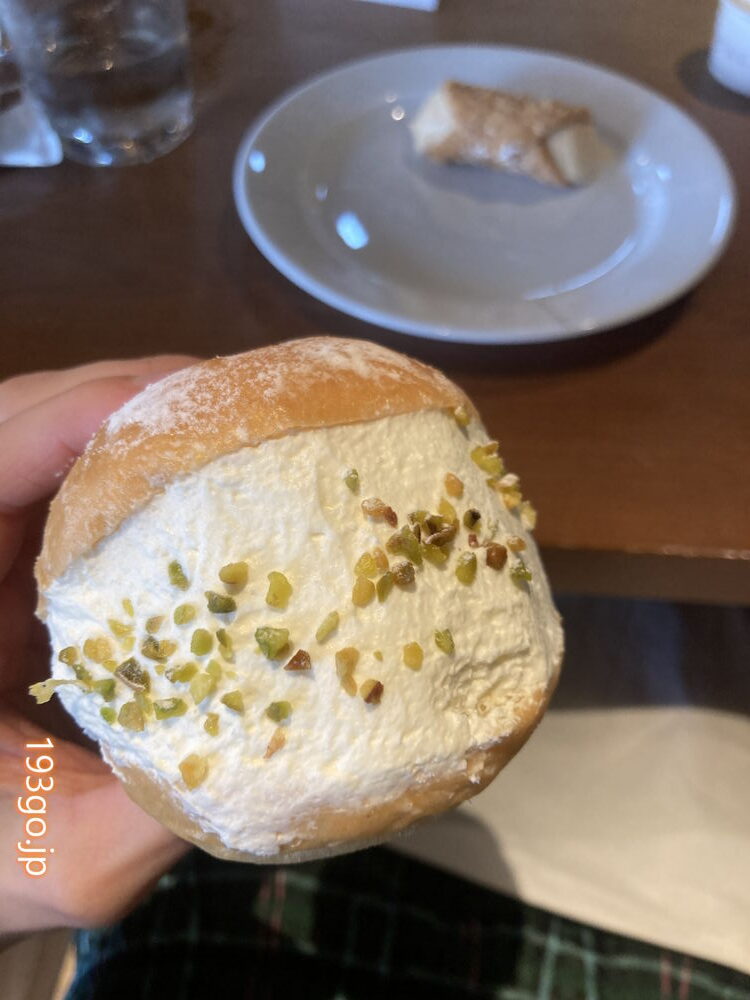 ソルティレモンのクリームがぎっしり詰まったローマの伝統菓子マリトッツォ。ピスタチオのトッピングで。