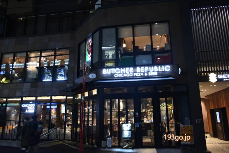 恵比寿の「ブッチャー・リパブリック エビス シカゴピザ & ビア(BUTCHER REPUBLIC EBISU CHICAGO PIZZA&BEER)」にシカゴピザを食べに行って来ました!東口から3分、通り沿いにありガラス張りで夜はキラキラ。