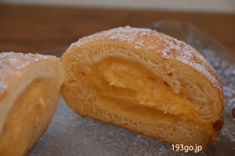 ボンボローニは、シュガーが塗されたしっかりしたドーナツ生地にクリームがぎっしり。クリームの範囲が広い。