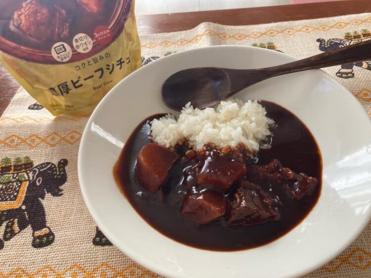 「コクと旨みの濃厚ビーフシチュー」は、正にコクと旨みをたっぷり感じる。ご飯にかけただけの何も手を加えなくても具がゴロっと濃厚。進化しすぎてビックリ!