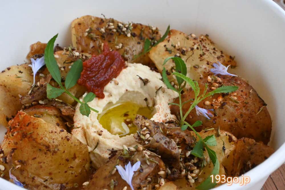 スマック(スパイス)や胡麻、ドライハーブなどオリジナルブレンドのスパイスやソースで味付けされ、清涼感あるハーブの香りと味わいがヤミツキ。手が止まらなくなる美味しさ。