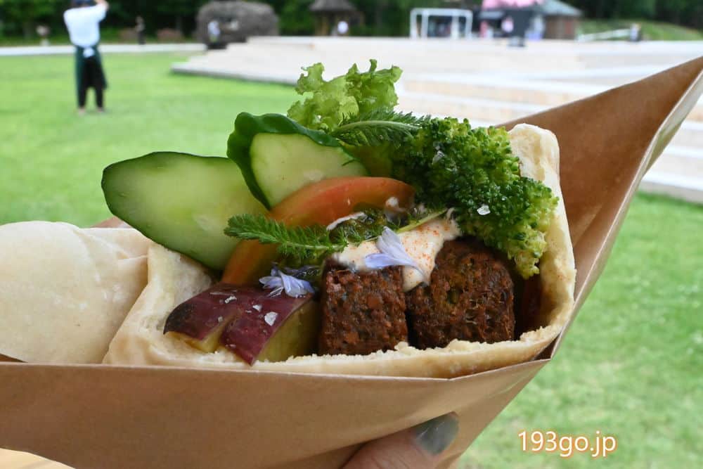 もちもち生地のピタに、ひよこ豆のコロッケ(ファラフェル)や、ひよこ豆ペースト(フムス)、富士北麓の野菜やハーブなどがモリモリに詰まったファラフェルピタサンド。