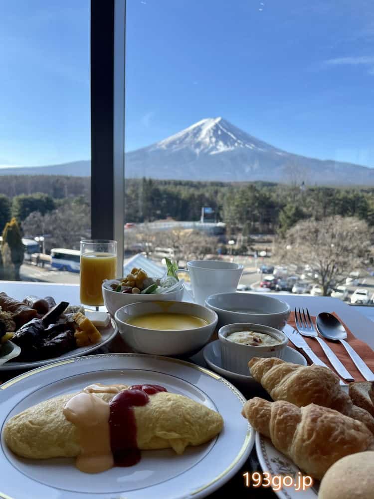 ホテルの朝食のオムレツとクロワッサンが富士山の背景で、映えてる~。