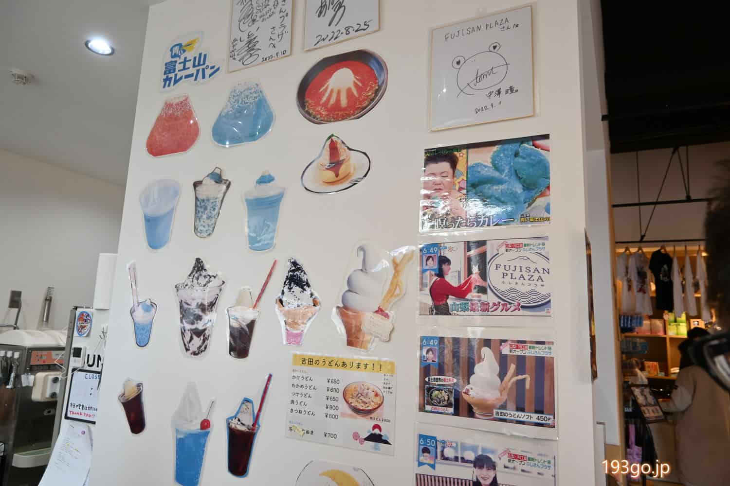 「富士山プラザ」メニューと値段 赤い富士山カレーパン、青い富士山カレーパン、吉田のうどんソフトも