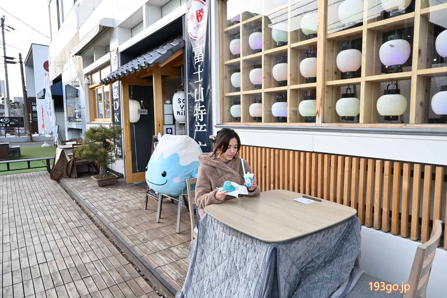 駅前のアンテナショップ「富士山プラザ」富士山モチーフのお土産や山梨特産品が並ぶ。カフェも併設。テイクアウトで、外にこたつが2台設置され、ここで食べることも出来る。冬に外でコタツに入って富士山カレーパンを食べてみた!