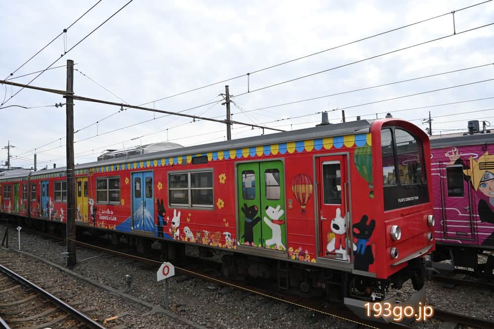 河口湖駅にはトーマスやリサとガスパール、NARUTOなどのラッピング列車が行き来していた。