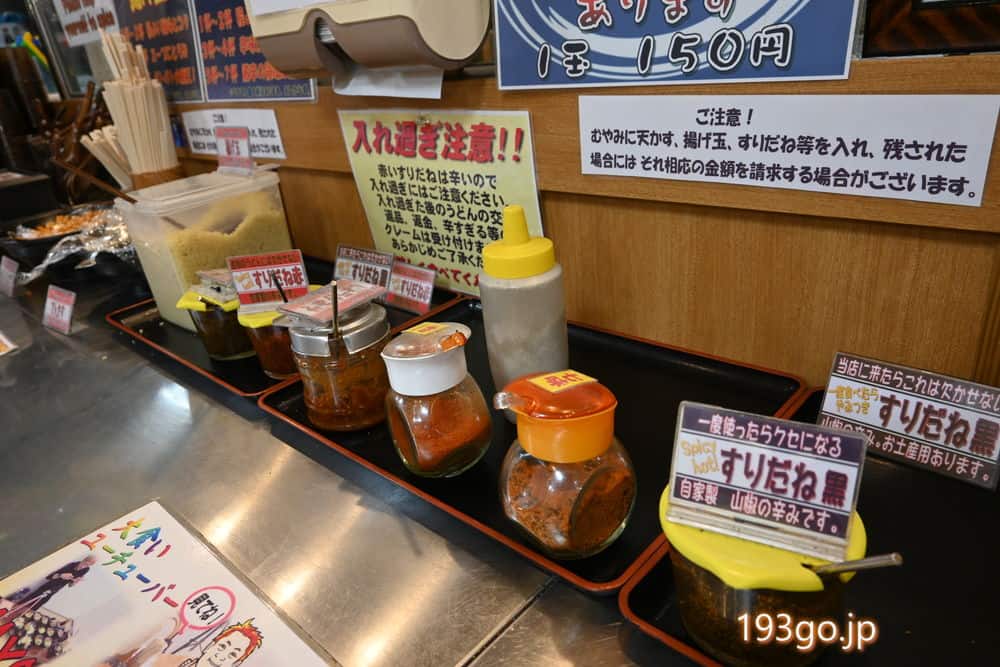 丼を受け取りトッピングコーナーには、富士山付近でよく見かけた辛味調味料「すりだね」や一味など。すりだねは自家製だ。※辛いので入れすぎ注意!
