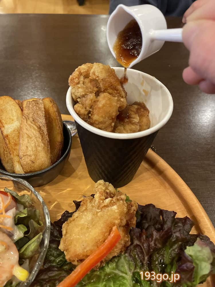 衣サクサクの唐揚げ(サウナストーン)は、紙コップ(サウナストーブ)に移して、ソースをかけていただく。この一連はロウリュをイメージしている。