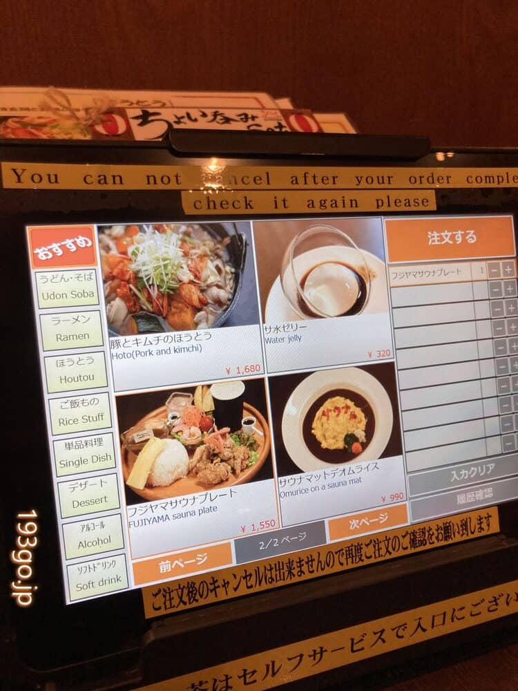 他にもカレーやラーメン、ほうとう、定食、ちょい飲みセットなどメニュー豊富。タッチパネルで注文するスタイル。(お会計はリストバンドで)