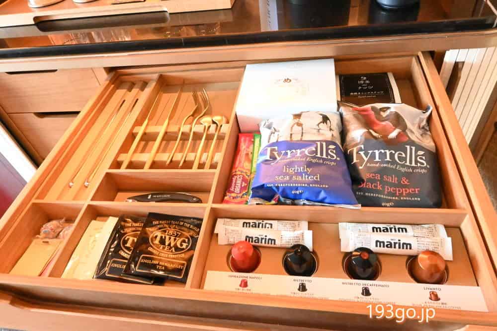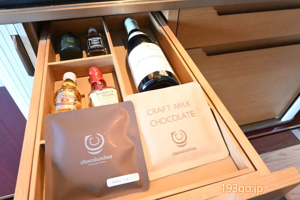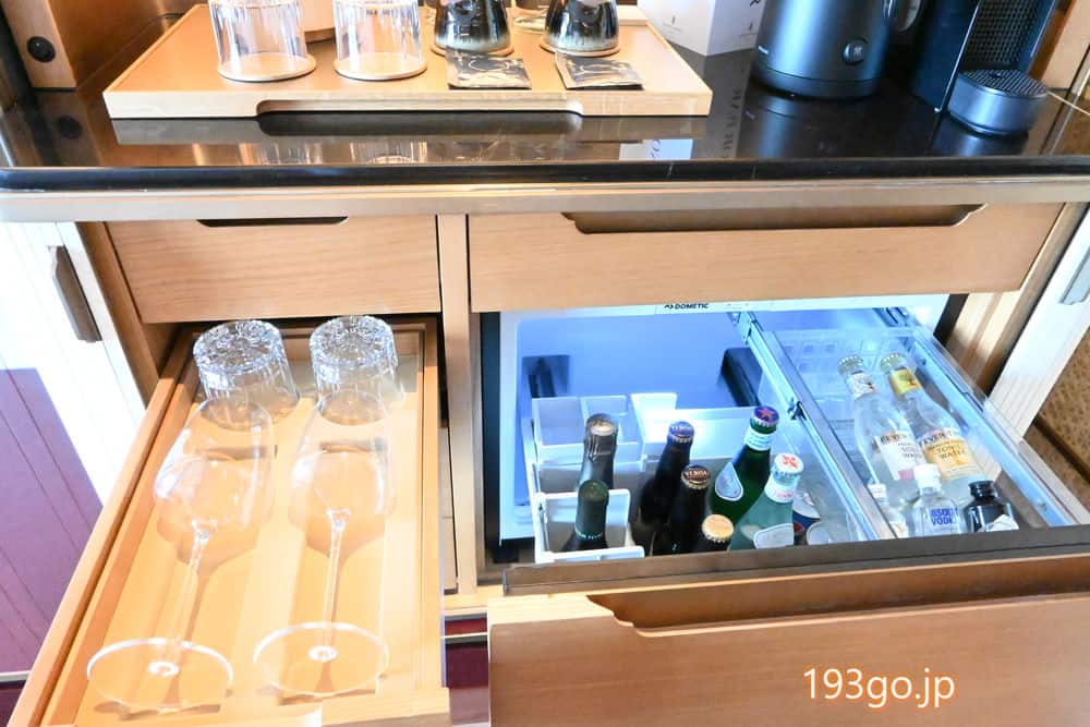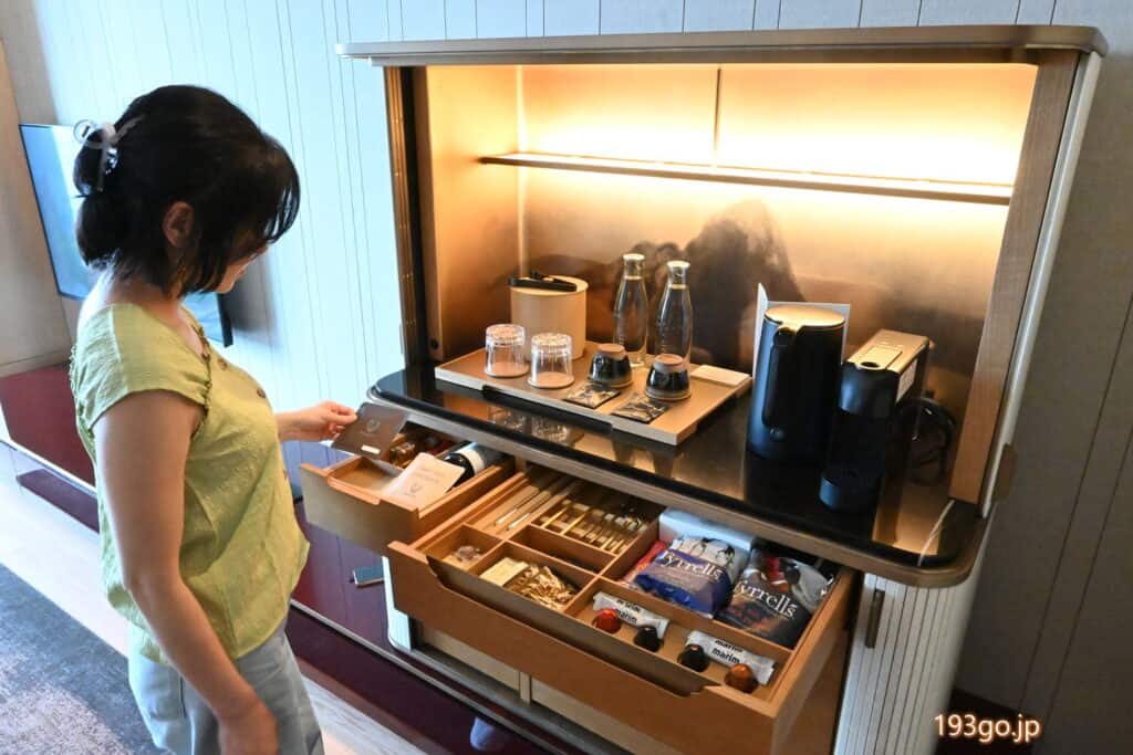 引き出しのスナック類や、冷蔵庫のアルコール含むドリンクは別料金となる。
