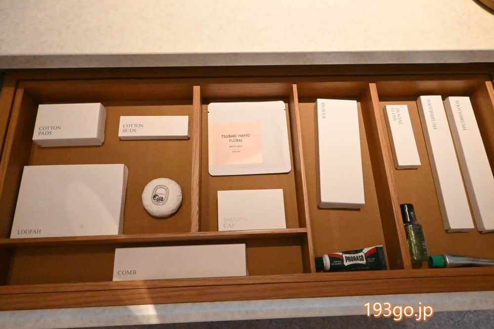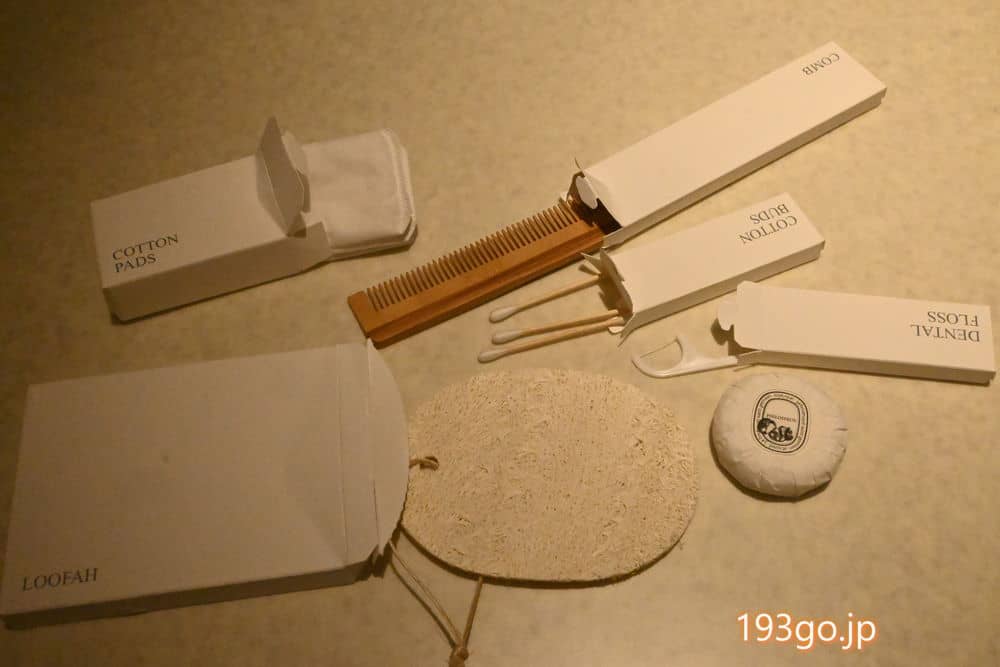 竹製の歯ブラシやヘアブラシ、綿棒、シェイバーなど、一つずつ箱入り。