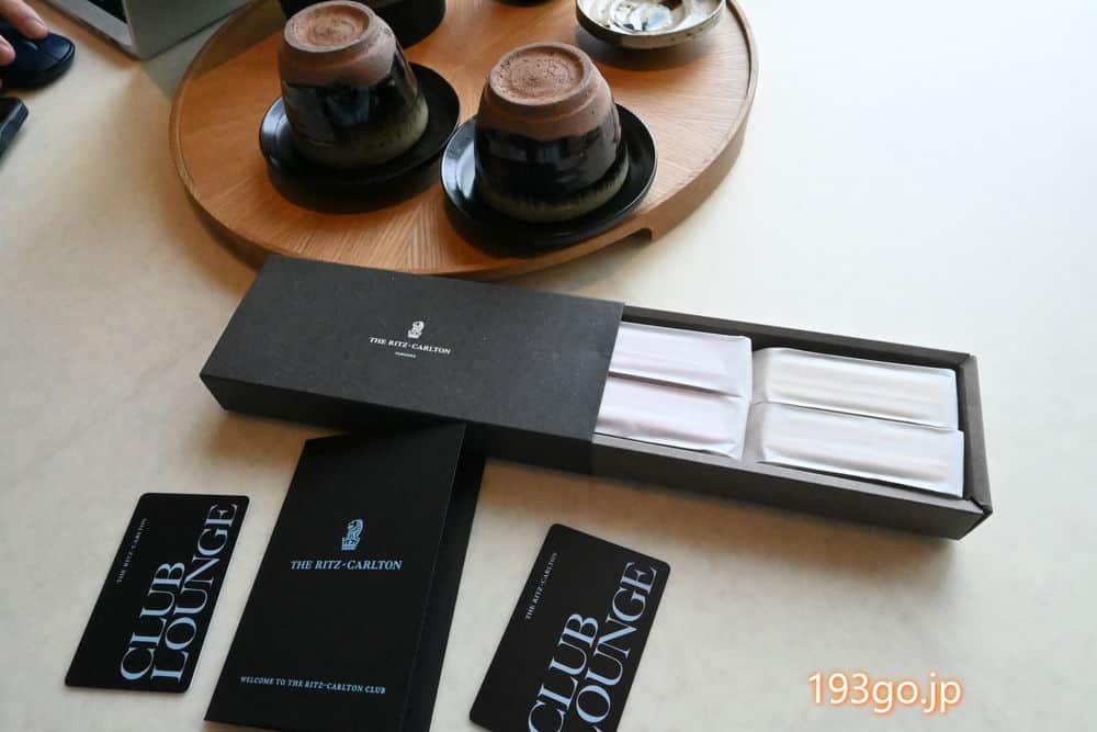 テーブルには、リッツカールトンのロゴ入りボックスに入ったお茶菓子が。