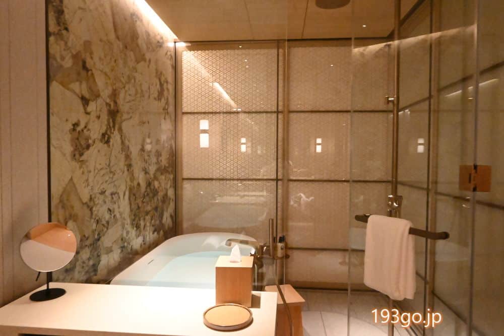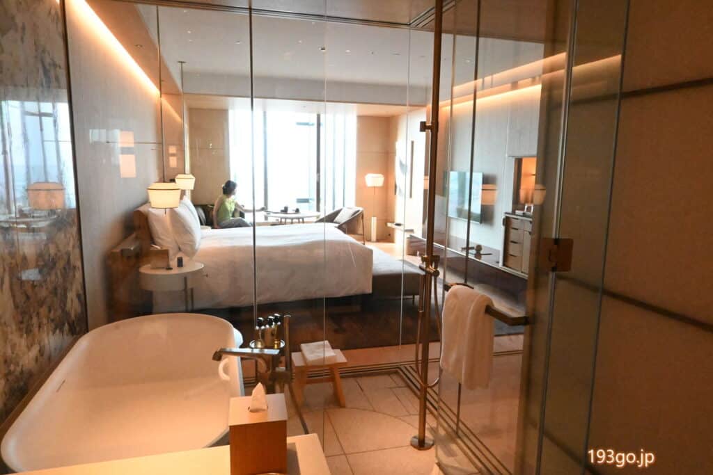 お部屋に入ると、ガラス張りのバスルームで開放感たっぷり。