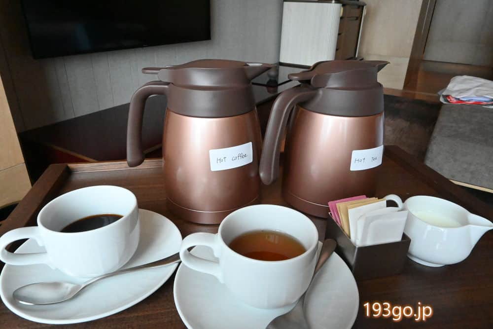 電話で起こしてもらった後に、コーヒーとティーをお部屋に運んでもらえる。