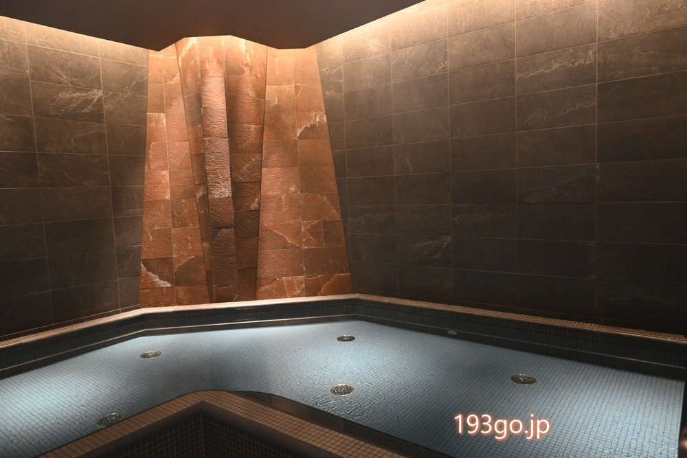 浴室内は、洞窟のような石造りの壁に間接照明が映えて、落ち着いた大人の雰囲気。