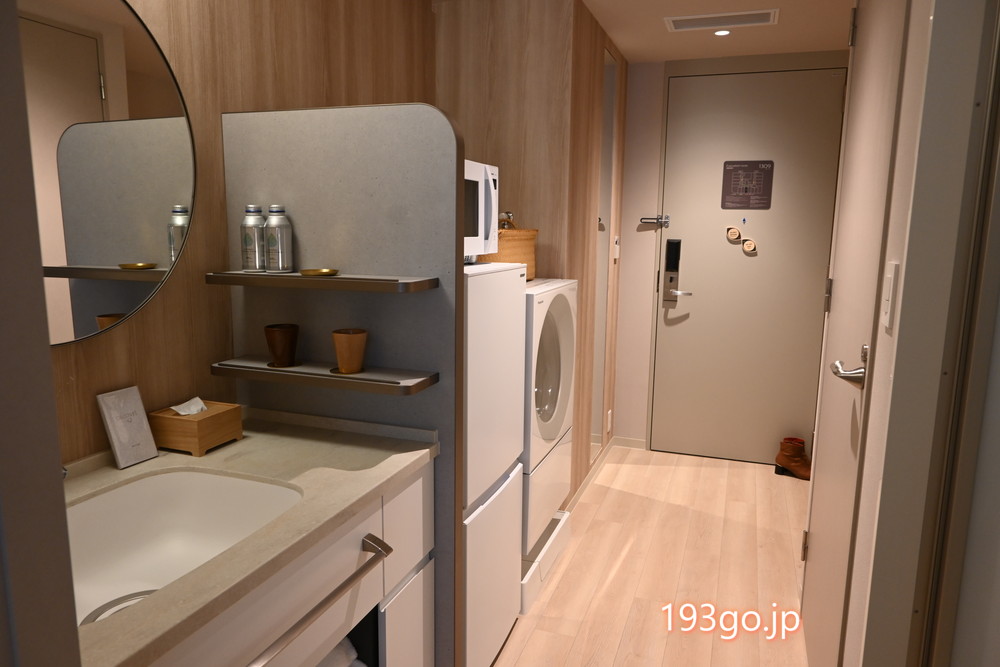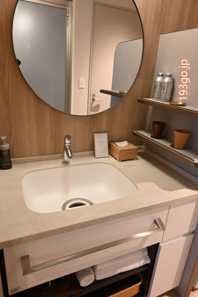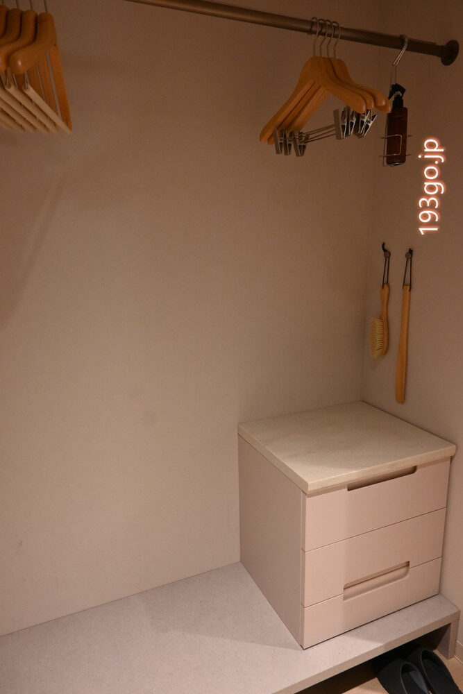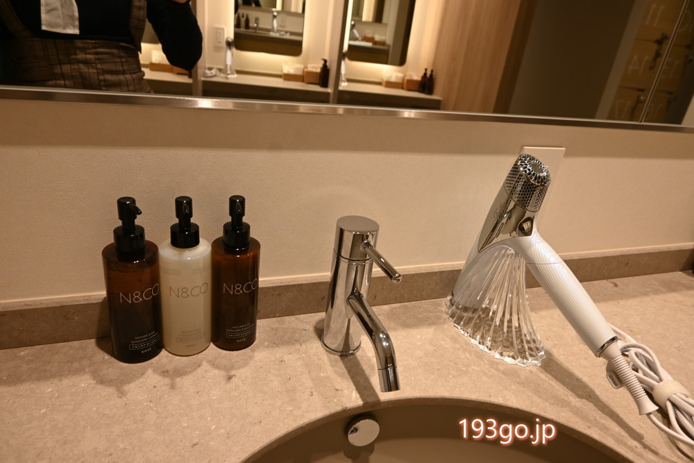 脱衣所には仕切りのあるパウダースペースがあり、クレンジングや化粧水、速乾性のあるReFa製ドライヤーなど、アメニティも充実。