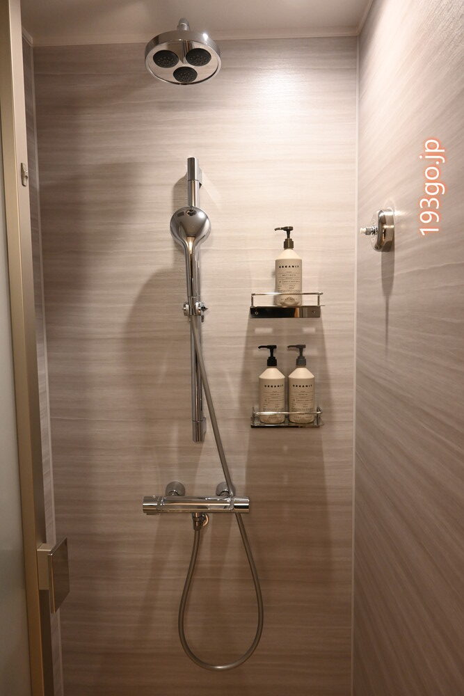 浴室内には半個室のシャワーが完備され、レインシャワーとハンドシャワー付き、バスアメニティも一式。椅子に座って洗えるタイプも一カ所。